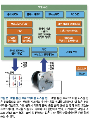 액텔의 퓨전 PSC와 같은 플래시 기반의 혼합신호 FPGA는 알고리즘 및 컨트롤 로직 업데이트를 모두 지원해 업계 표준 또는 고유의 사용자 인터페이스, 원격 관리 기능, 제어 알고리즘 및 센서 입력 향상을 제공한다. 가장 이상적인 모션 컨트롤 설계는 아무 문제없이 함께 동작할 수 있도록 설계된 상호운용이 가능한 부품으로 구성되어 있는 것이라 할 수 있다. 혼합신호 FPGA 솔루션은 높은 집적도를 제공함으로써 이러한 요구를 충족한다. 뿐만 아니라 부품 수, 보드 공간 및 전체 시스템 비용을 낮출 수 있어 신뢰성과 업타임을 더욱 향상시킨다.