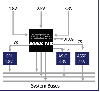 Many products require the use of logic devices of varying voltages. To support multi-voltage applications, designers frequently need to connect devices of differing voltage levels. CPLDs have a large number of I/Os which are grouped into multiple banks. Each I/O bank is, in turn, assigned a unique voltage source. Thus, creating a voltage-level shifter is merely a matter of grouping all the I/Os of one voltage in one bank and connecting the associated voltage reference to the power rail needed for those I/Os (See Figure 2). While it is useful to be able to accomplish level shifting using a CPLD, an even greater advantage is derived from the power of programmability combined with the level shifting. For example, if an application calls for an LCD display that is not supported by the host processor and is not at the same voltage level, a CPLD could be used to provide voltage-level shifted timing control between the host processor and an LCD display.