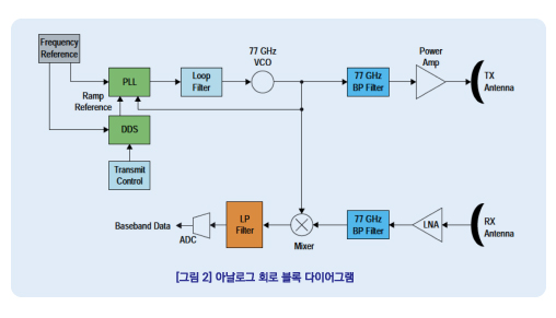 CWFM 레이더 아키텍처의 장점은 아날로그와 디지털 구현 방법 모두가 간단하다는 것이다. 아날로그 측면에서 표준 레퍼런스 크리스털을 사용하여 DDS(direct digital synthesizer)를 통해 송신기를 구현할 수 있다. DDS는 PLL(phased-locked loop)을 위한 아날로그 주파수 램프 레퍼런스를 생성하여 필요한 전송 주파수 변조를 생성할 수 있다. 예를 들어, PLL이 1000의 디바이더를 사용한다면, 본고의 예제에서는 레퍼런스는 77MH의 중앙 주파수와 5MHz 주파수 램프를 가지게 된다. 이 아날로그 램프 신호는 77GHz 오실레이터를 관리하는 PLL의 레퍼런스를 구동한다. 회로의 오실레이터 출력은 증폭되어 77GHz의 중앙 주파수를 통해 500MHz까지 상승/하강하는 CW(continuous wave) 신호를 생성한다. 77GHz의 필터링 및 매칭 회로는 하이-엡실론 R 유전체 회로 카드로 에칭된 수동 부품들을 통해 구성될 수 있으며, 필요한 부품을 최소화할 수 있다. 그림 2는 아날로그 회로 블록 다이어그램이다.