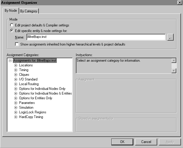 You can assign the logic in your design to specific device resources. For example, you can assign the logic of a block in a Block Design File (.bdf) to a specific MegaLAB row in a device. MegaLABs are large-scale structures within APEX 20K, APEX II, and ARM®-based Excalibur devices. To assign the logic of the taps