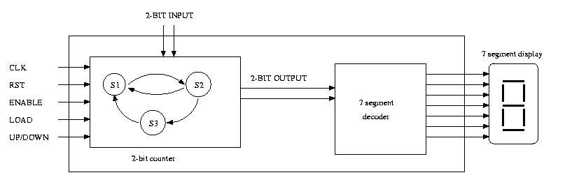 2. The clock on the XS40 is too fast to verify your counter. You will need to add a clock divider ( clkdiv.vhd) to your code. This will slow down the clock from your XS40 board to your counter so that you can observe the results. The output from the clock divider will only pulse once every second. The schematic below will give you an idea of how to connect the clock divider.
