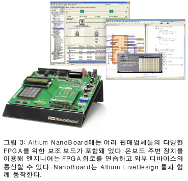 Altium의 NanoBoard 개발 시스템(그림 3)은 엔지니어에게 "디바이스 독립"을 제공한다. 15개의 보조 카드 덕분에 엔지니어는 Xilinx, Altera, Actel의 다양한 FPGA를 선택할 수 있다. 보조 보드를 바꾸면 다른 FPGA 군을 대상으로 작업할 수 있다. NanoBoard는 설계를 시험하기 쉽도록 LCD, LED, 스위치, 메모리 및 다양한 표준 주변 장치와 함께 제공된다. 시제품 또는 제품 단계로 이동해야 할 시점이 되면 Altium 툴의 구성 시스템은 업체의 디바이스로 매핑되는 FPGA-특화 파일을 생성한다. Martin은 "다양한 대상에 대해 다양한 구성을 할 수 있다"고 설명했다.